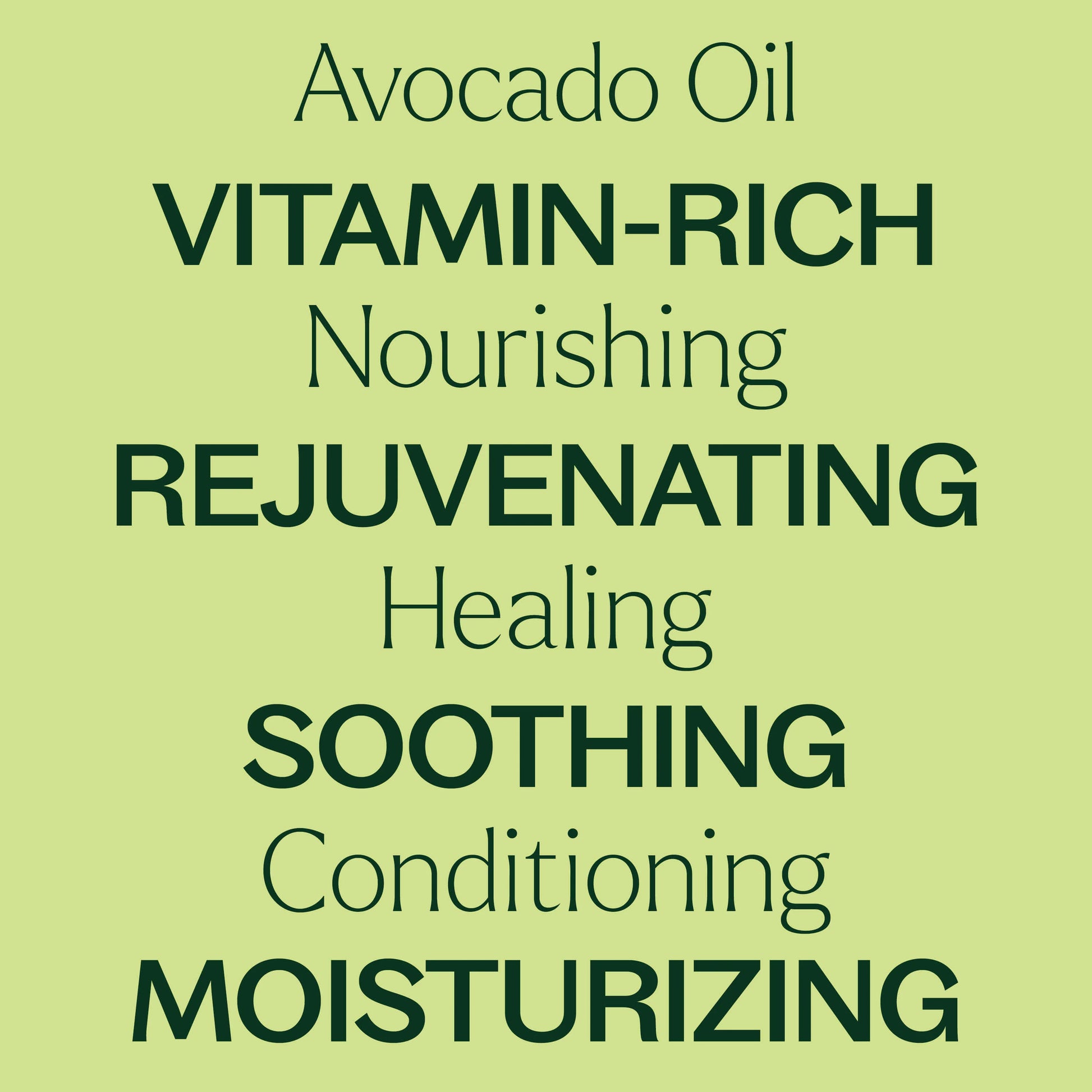 Avocado carrier oil contains Vitamins A, B, D, E, and Beta carotene. It is a deeply penetrating monounsaturated oil and is best suited for very dry, mature, irritated, or sun-damaged skin and hair.